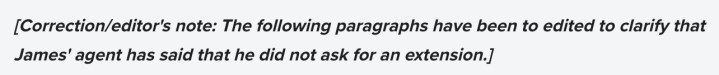 但YaronWeitzman今日将文章进行了更新,他写道:“[更正/注释:本文内容已经修改,詹姆斯的经纪人已经表示他并未要求提前续约。]”